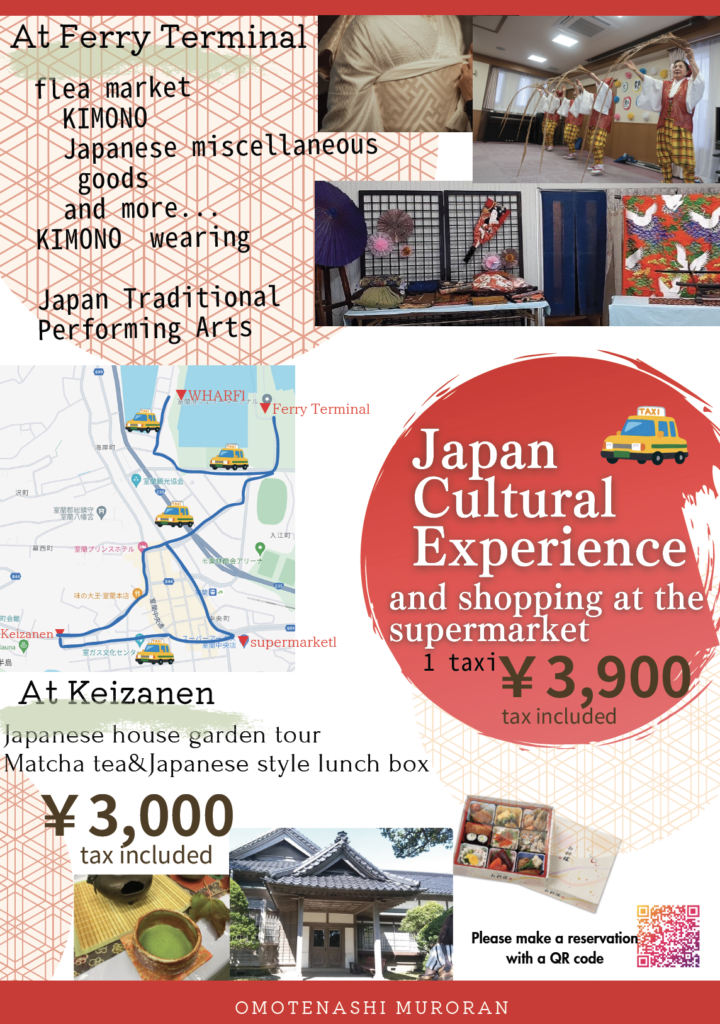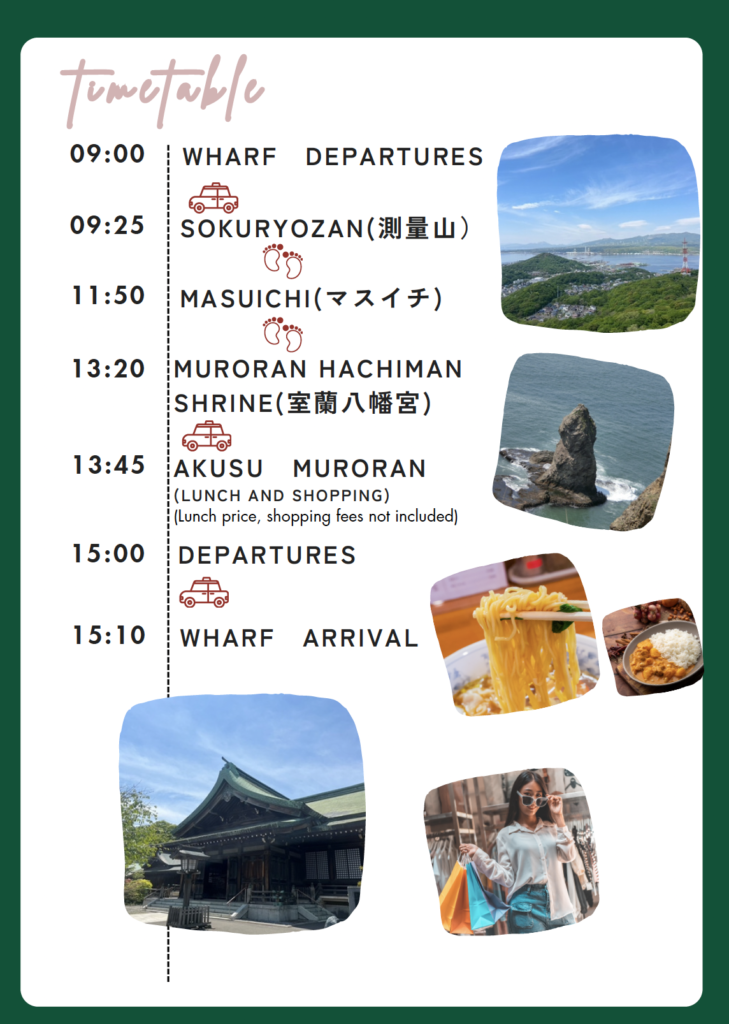 室蘭ウォーキング協会の方々にガイドを依頼し、一緒に室蘭を歩きます。室蘭を360度ぐるっと一望できる測量山からは客船ヘリテージ・アドベンチャラーも見れます。その後マスイチまで歩き、室蘭八幡宮へとご案内します。室蘭八幡宮ではおみくじを引いたり、日本文化に触れていただきます。そこからタクシーに乗り、スーパーアークス室蘭中央店にてお買い物や昼食を楽しんでいただけます。